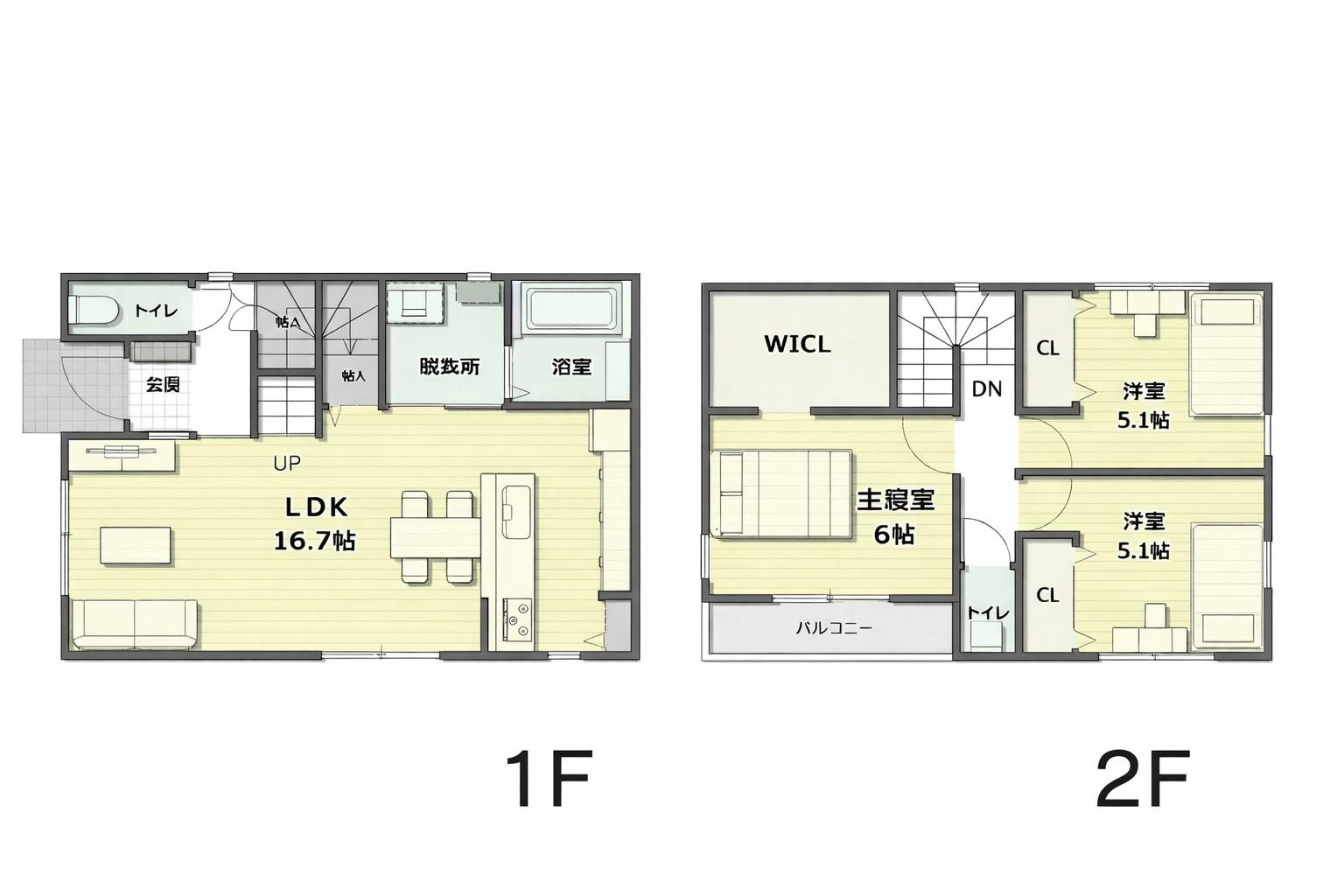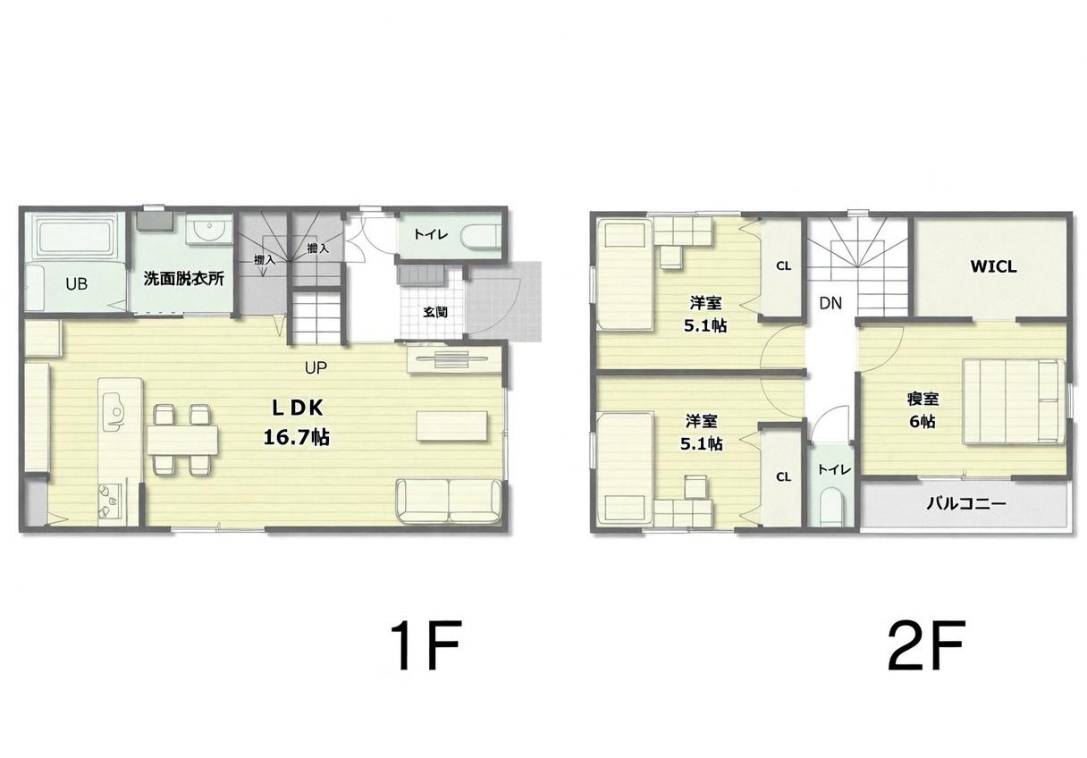 | 間取り詳細 | 1階:LDK16.7帖 LDKは広々とした16.7帖。 ダイニングテーブルやソファを配置してもゆとりがあり、快適にお使いいただけます。 南向きのため日当たりが良く、日中は照明を使わなくても過ごせるほど明るい空間です。 2階:主寝室洋室6帖+WICL+バルコニー 洋室5.1帖×2室 2階には6帖の主寝室にウォークインクローゼットを備え、インナーバルコニーも設置。 さらに5.1帖の洋室が2部屋あり、子ども部屋や書斎としても活用できます。 4人家族でもゆとりを持って暮らせる間取りです。 |